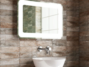 - Circular illuminated mirror mounted on a smoked mirrored glass